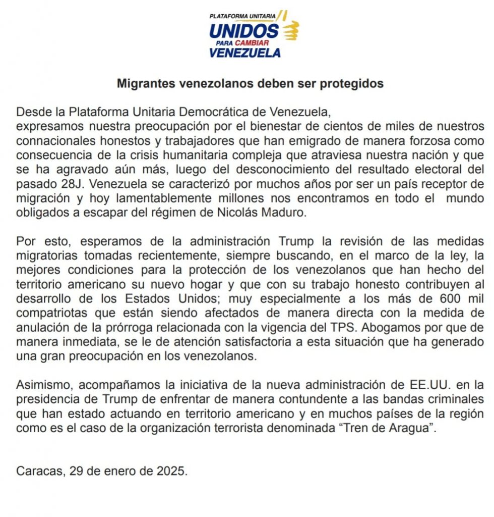 “Esperamos de la administración de Trump la revisión de las medidas migratorias tomadas recientemente, siempre buscando, en el marco de la ley, las mejores condiciones para la protección de los venezolanos”, escribió la PUD en un comunicado publicado en redes.