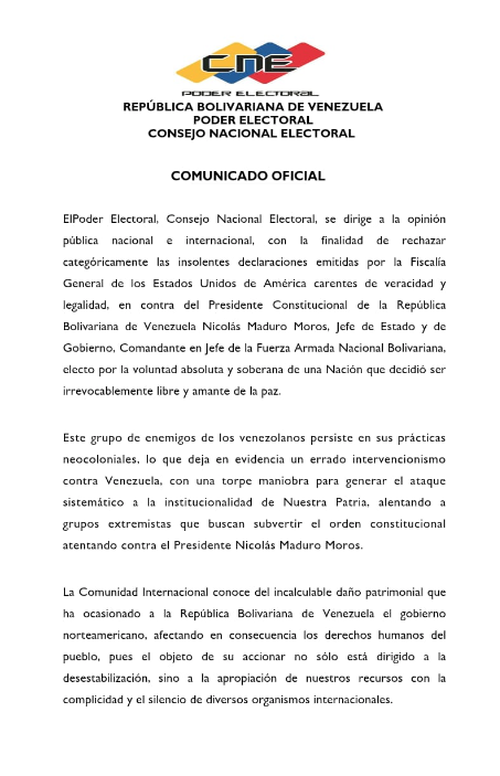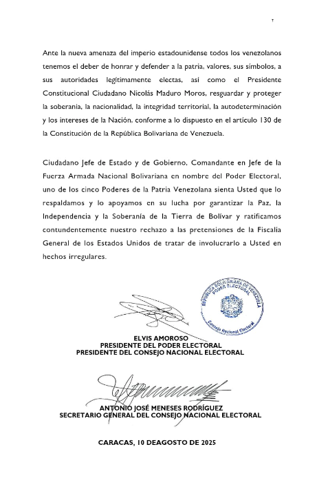 «Ciudadano jefe de Estado y de Gobierno, comandante en jefe de la Fuerza Armada Nacional Bolivariana, en nombre del Poder Electoral, uno de los cinco Poderes de la patria venezolana, sienta usted que lo respaldamos y lo apoyamos en su lucha por garantizar la paz, la independencia y la soberanía de la tierra de Bolívar, y ratificamos contundentemente nuestro rechazo a las pretensiones de la Fiscalía General de los Estados Unidos de tratar de involucrarlo a usted en hechos irregulares», concluye parte del comunicado.