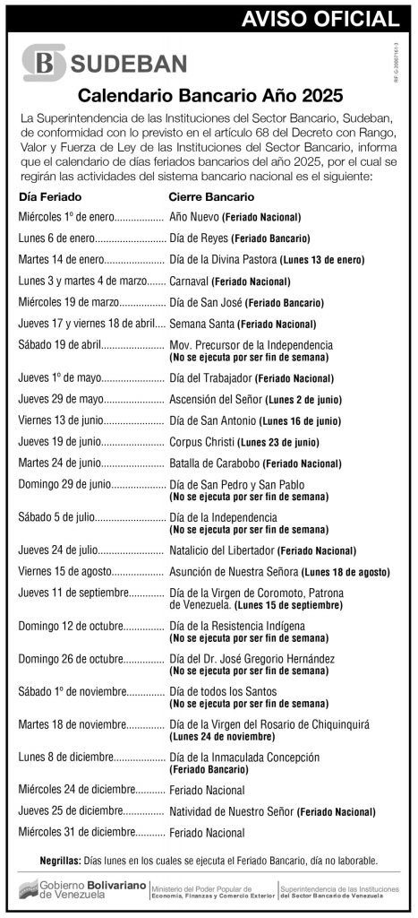 El próximo lunes 18 de agosto de 2025, el sector bancario no prestará servicio en todo el país por la «Asunción de Nuestra Señora», según el calendario establecido por la Superintendencia de las Instituciones del Sector Bancario (Sudeban).