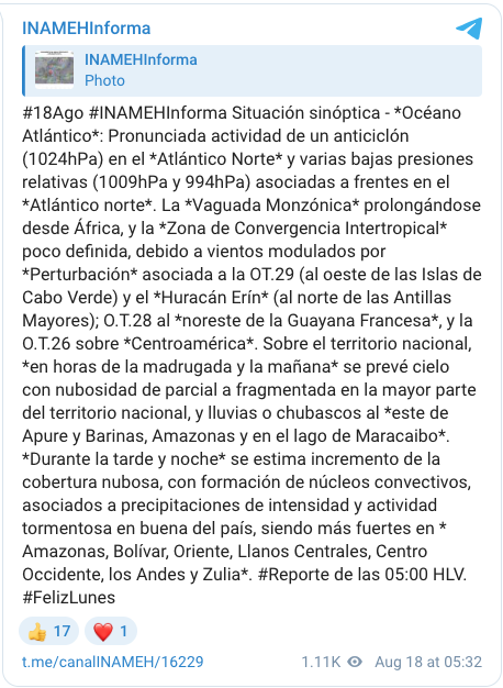 La información fue publicada en el canal de Telegram, del Instituto Nacional de Meteorología e Hidrología (Inameh), donde reseña que durante la tarde y noche se estima incremento de la cobertura nubosa, con formación de núcleos convectivos, asociados a precipitaciones de intensidad y actividad tormentosa en buena parte del país, siendo más fuertes en Amazonas, Bolívar, Oriente, Llanos Centrales, Centro Occidente, los Andes y Zulia.
