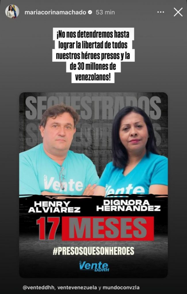 Este mensaje fue enviado por Machado con motivo de los 17 meses «secuestrados» que cumplen este miércoles los dirigentes Henry Alviarez y Dignora Hernández, miembros del equipo político de Vente Venezuela.