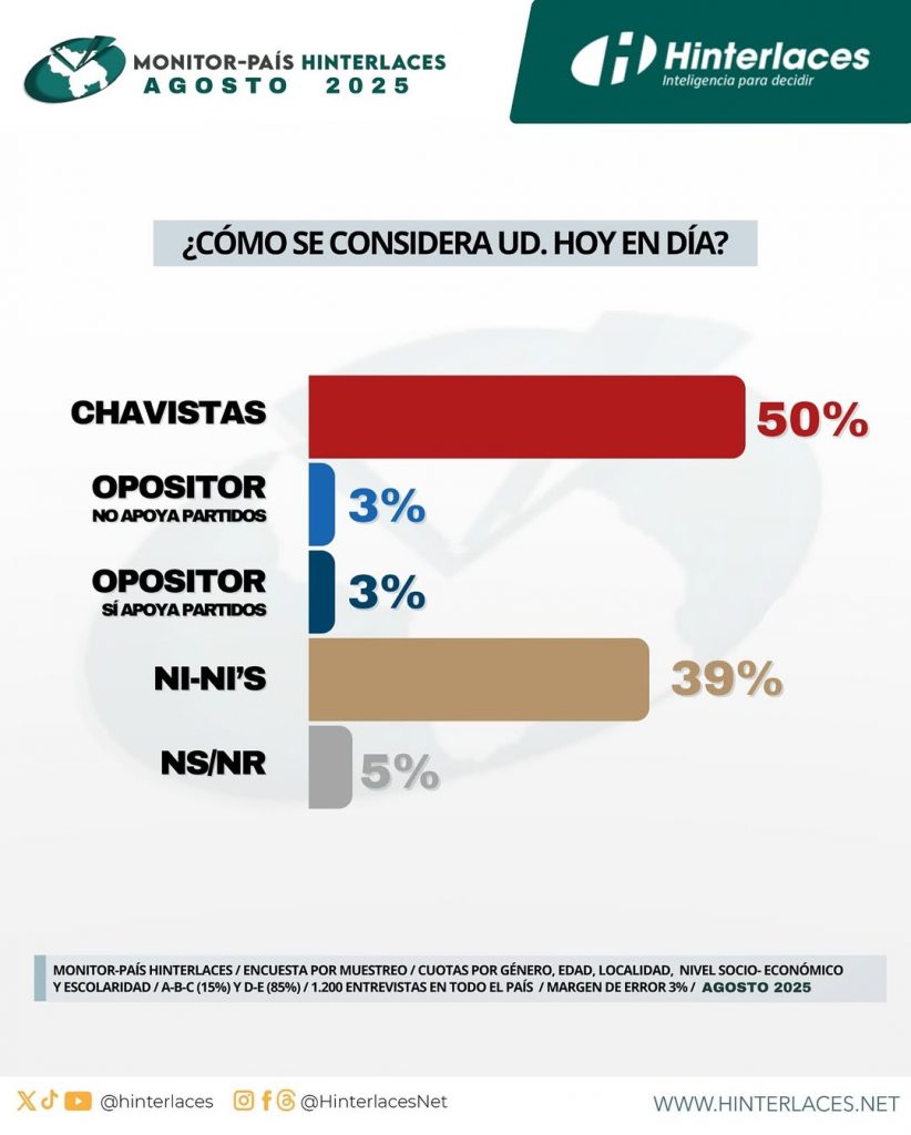 Otra de las consultas que hizo Hinterlaces indica que el 50% de la muestra se considera chavista mientras que la otra mitad se divide entre 39% de «ninis», 5% que no sabe no contesta y 6%, dividido en partes iguales entre opositores que apoyan los partidos y los que están lejos de la organizaciones políticas.