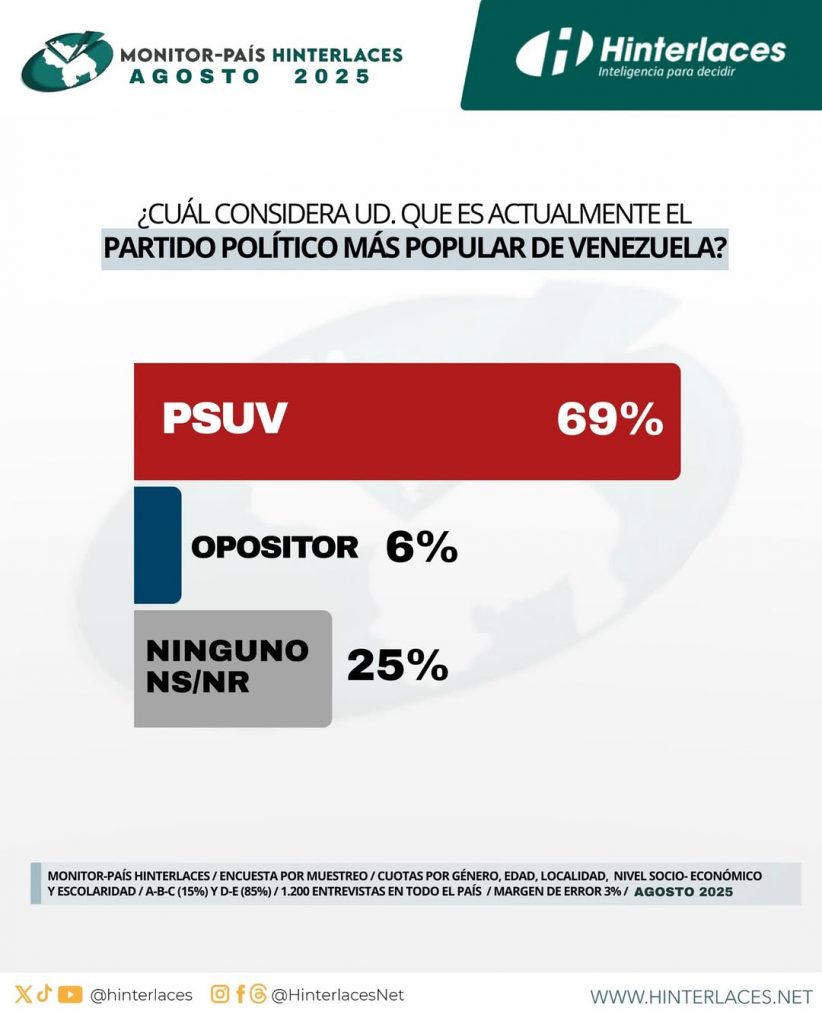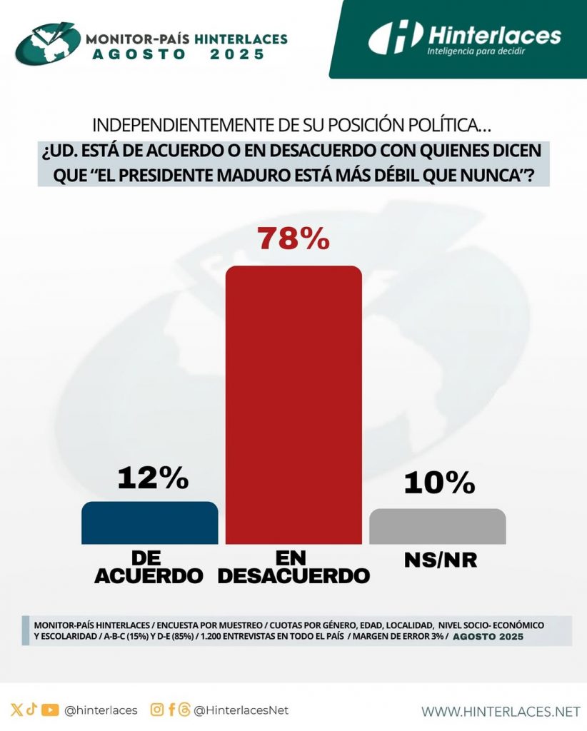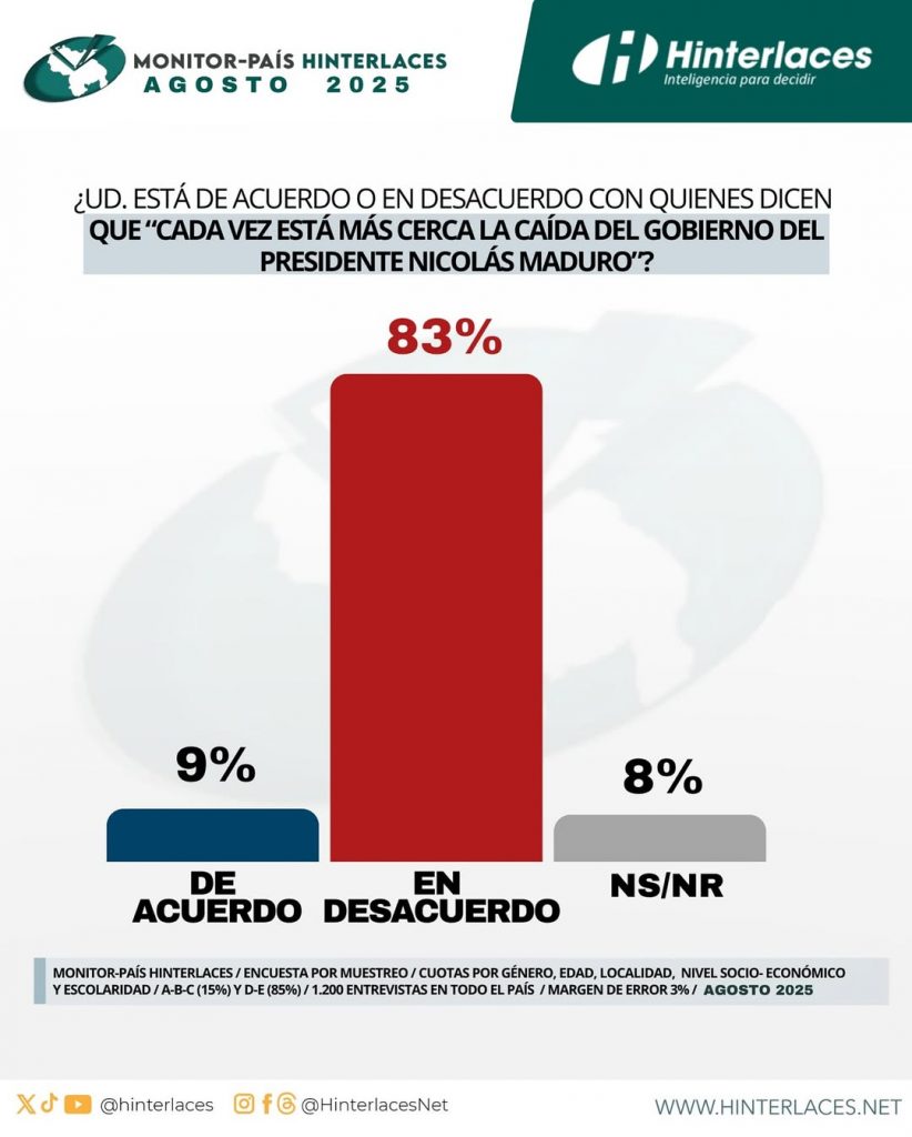 La firma consultora Hinterlaces señala en su estudio Monitor-país de agosto 2025 que el 83% de sus consultados se muestra en desacuerdo con la afirmación que señala «cada vez está más cerca la caída del Gobierno de Nicolás Maduro».