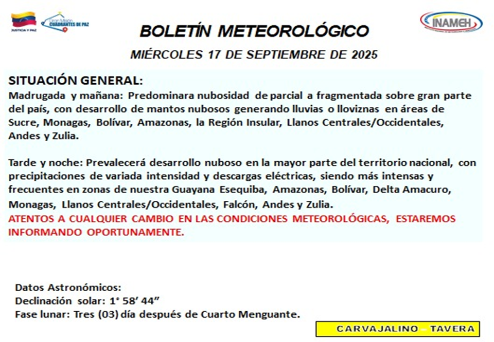 De igual forma, en horas de la tarde y noche prevalecerá desarrollo nuboso en la mayor parte del territorio nacional, con precipitaciones de variada intensidad y descargas eléctricas, que serán más intensas y frecuentes en zonas de la Guayana Esequiba, Amazonas, Bolívar, Delta Amacuro, Monagas, Llanos Centrales/Occidentales, Falcón, Andes y Zulia.