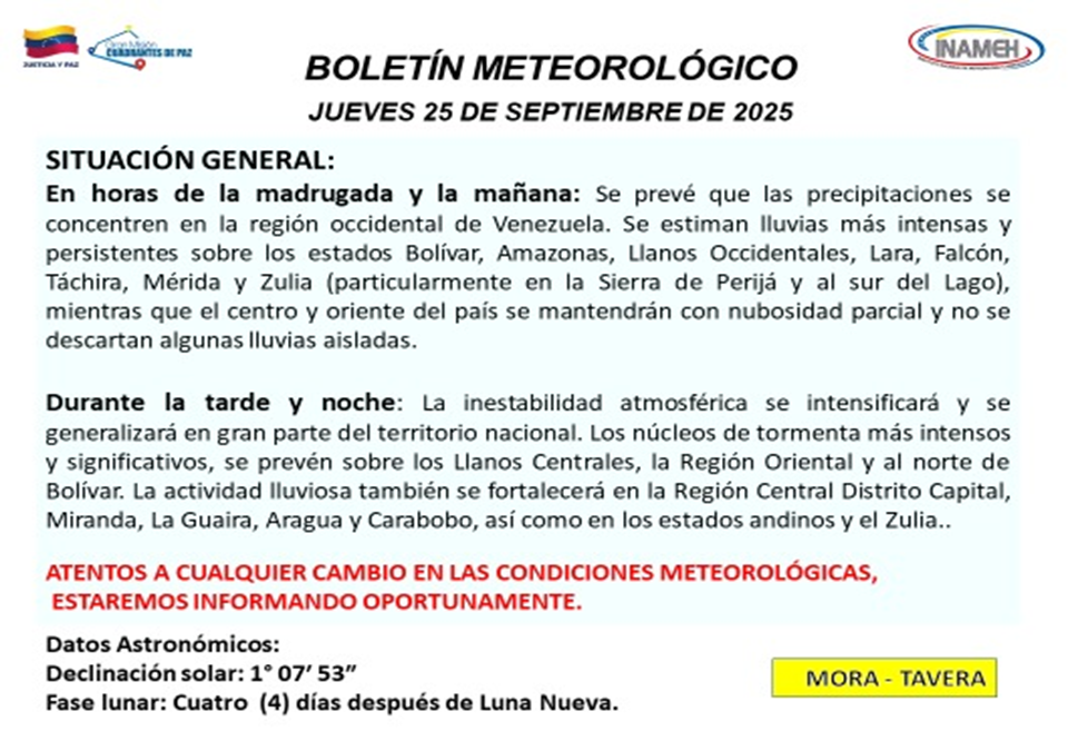 De acuerdo con el boletín de las autoridades del Instituto Nacional de Meteorología e Hidrología (Inameh) durante la tarde y noche la inestabilidad atmosférica se intensificará y se generalizará en gran parte del territorio nacional. Los núcleos de tormenta más intensos y significativos, se prevén sobre los Llanos Centrales, la Región Oriental y al norte de Bolívar. La actividad lluviosa también se fortalecerá en la Región Central Distrito Capital, Miranda, La Guaira, Aragua y Carabobo, así como en los estados andinos y el Zulia.