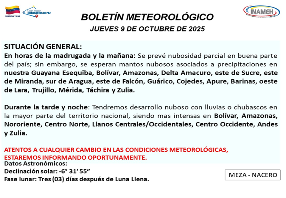 Este jueves en horas de la mañana se prevé nubosidad parcial en buena parte del país; sin embargo, se esperan mantos nubosos asociados a precipitaciones en la Guayana Esequiba, Bolívar, Amazonas, Delta Amacuro, Sucre, este de Miranda, sur de Aragua, Falcón, Guárico, Cojedes, Apure, Barinas, oeste de Lara, Trujillo, Mérida, Táchira y Zulia.