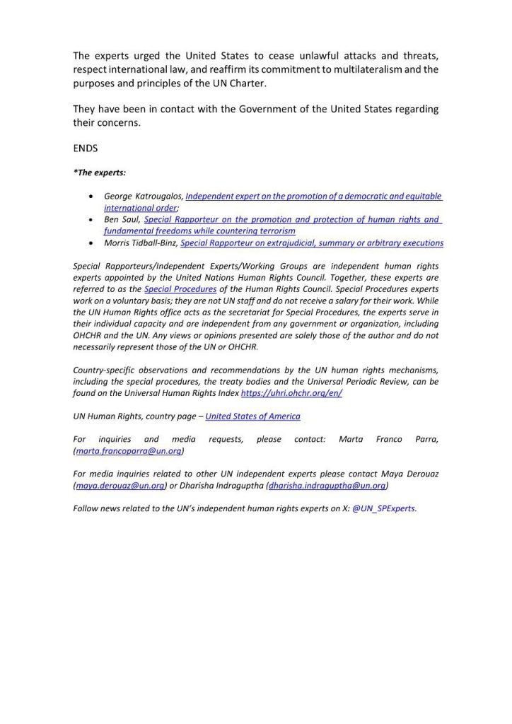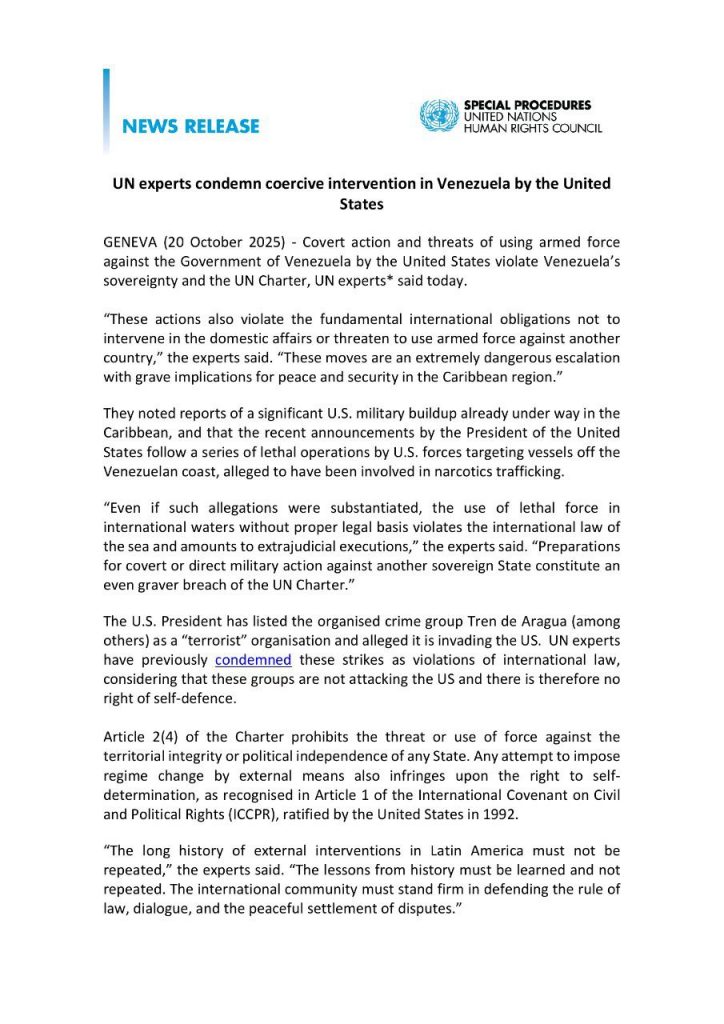 Los expertos señalaron que “la larga historia de intervenciones externas en América Latina no debe repetirse”, en referencia a los riesgos que implican operaciones militares sin respaldo jurídico internacional.