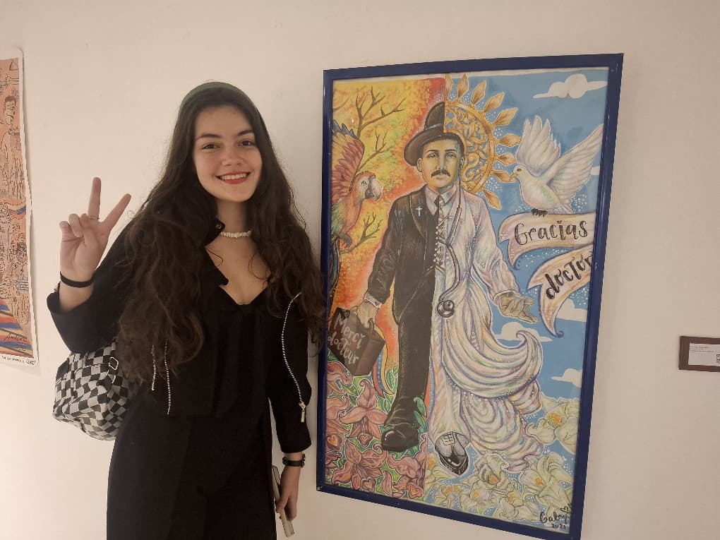 Gabriela Da Silva, estudiante de Artes de la UCV, con tan solo 23 años de edad, aprovechó para exhibir una obra que hizo en agradecimiento al «Médico de los Pobres«, que lleva por nombre «Divina Terredad» cuadro que pintó para mostrar su devoción y la fe que le tienen al santo, ella y su familia.