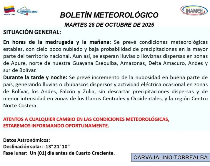 Este martes en horas de la mañana se prevé condiciones meteorológicas estables, con cielo poco nublado y baja probabilidad de precipitaciones en la mayor parte del territorio nacional. Aun así, se esperan lluvias o lloviznas dispersas en zonas de Apure, norte de la Guayana Esequiba, Amazonas, Delta Amacuro, Andes y sur de Bolívar, reseña el boletín del Instituto Nacional de Meteorología e Hidrología (Inameh).