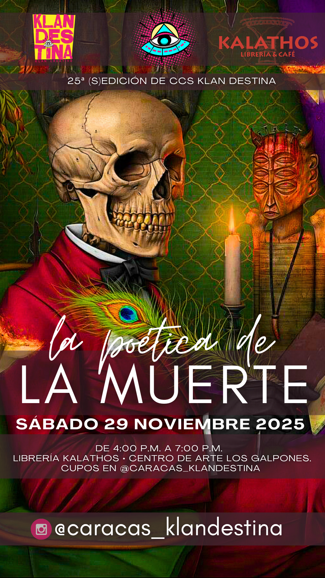 Este próximo sábado 29 de noviembre, de 4 p.m. a 7 p.m. en la Librería Kalathos, se celebrará la vigésimo quinta edición de @caracas_klandestina dedicada a «La poética de la muerte», en la que distinguidos panelistas entre los que figuran médicos psiquiatras, psicólogos, sexólogos, filósofos, maestros, educadores, escritores, poetas, astrólogos, tarotistas, comunicadores sociales, investigadores, artistas y músicos, nos regalarán su mirada performática, esencial e insomne sobre este crucial tema del existencialismo.
