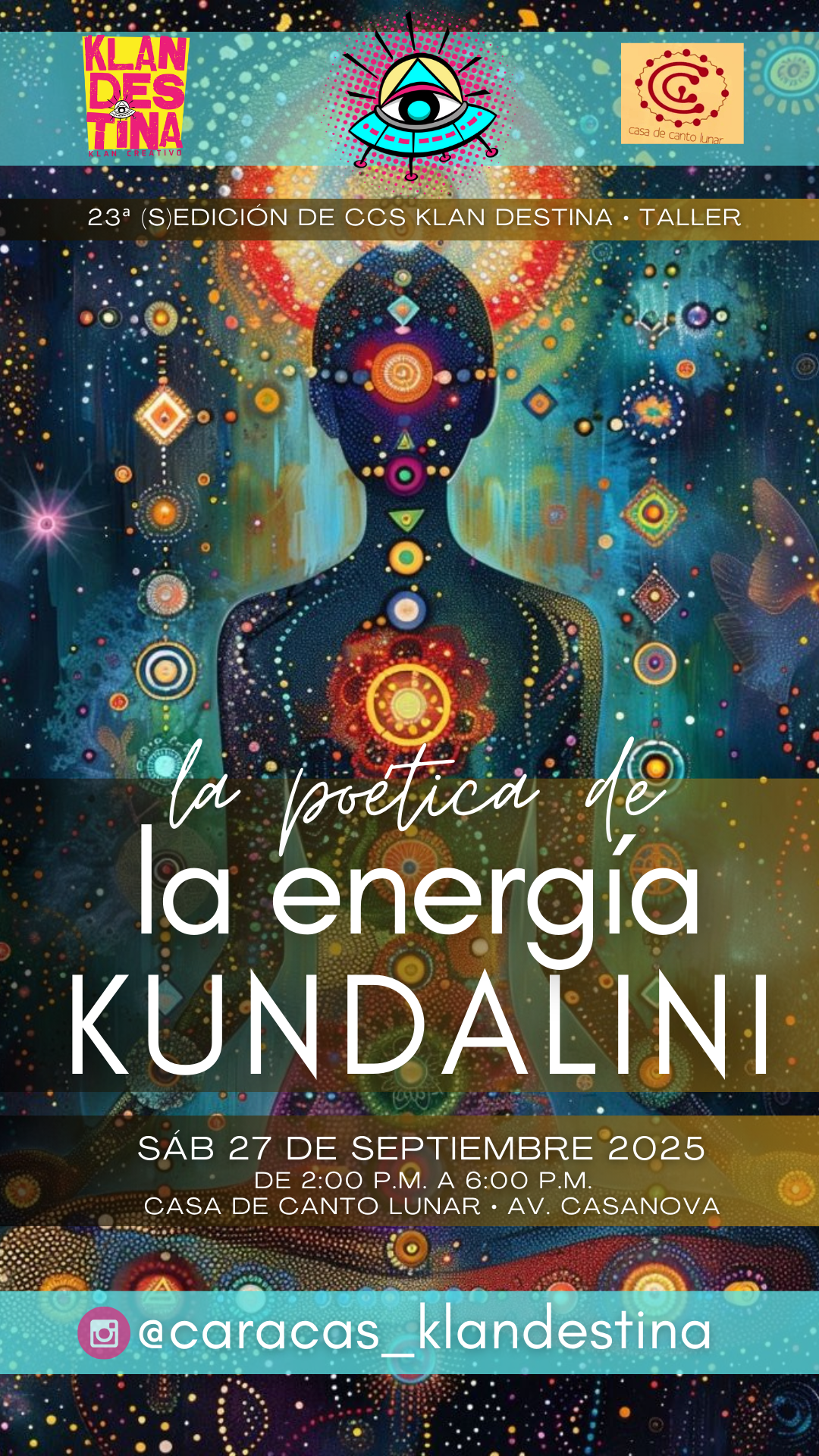 CCS KLAN DESTINA presenta en su vigésima tercera edición, un maravilloso taller dedicado a «La poética de la energía Kundalini», a celebrarse este sábado 27 de septiembre, de 2 a 6 p.m. en los acogedores espacios de Casa de canto lunar (Caracas-Venezuela).