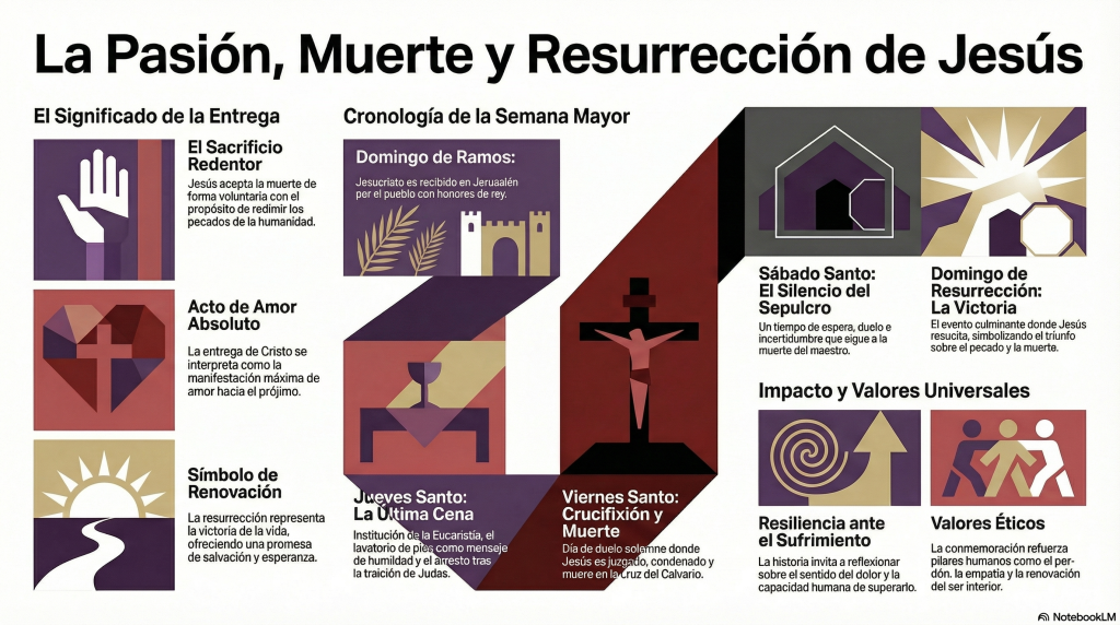 La Semana Mayor recuerda el momento en que, según la tradición cristiana, Jesucristo se entrega voluntariamente por la humanidad. Su significado central se basa en tres ideas: