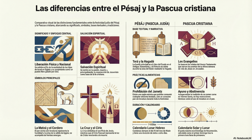- Pascua cristiana: Se enfoca en la salvación espiritual. Conmemora la pasión, muerte y, fundamentalmente, la resurrección de Jesucristo.