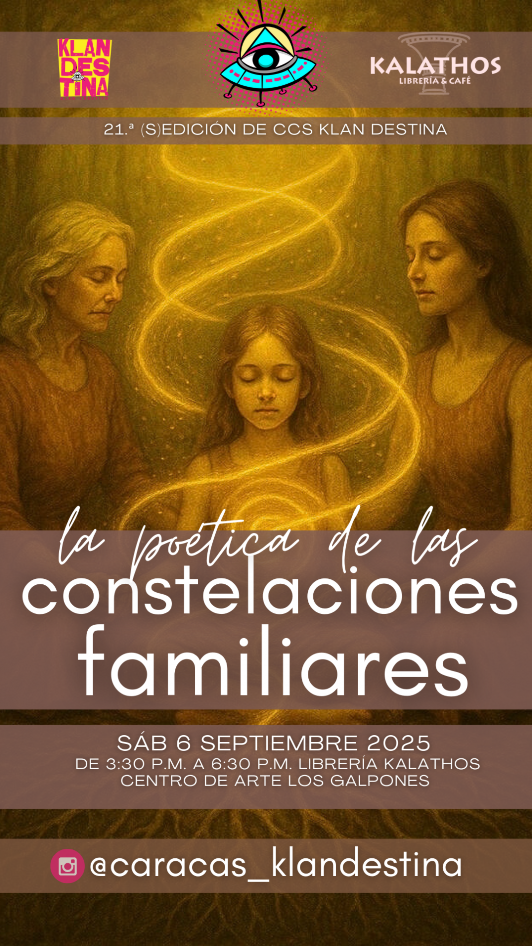 Este sábado 6 de septiembre desde las 3:30 de la tarde, en la Librería Kalathos (ubicada en el Centro de Arte Los Galpones-Los Chorros), CCS KLAN DESTINA celebrará su vigésima primera edición con un tema crucial: «La poética de las constelaciones familiares».