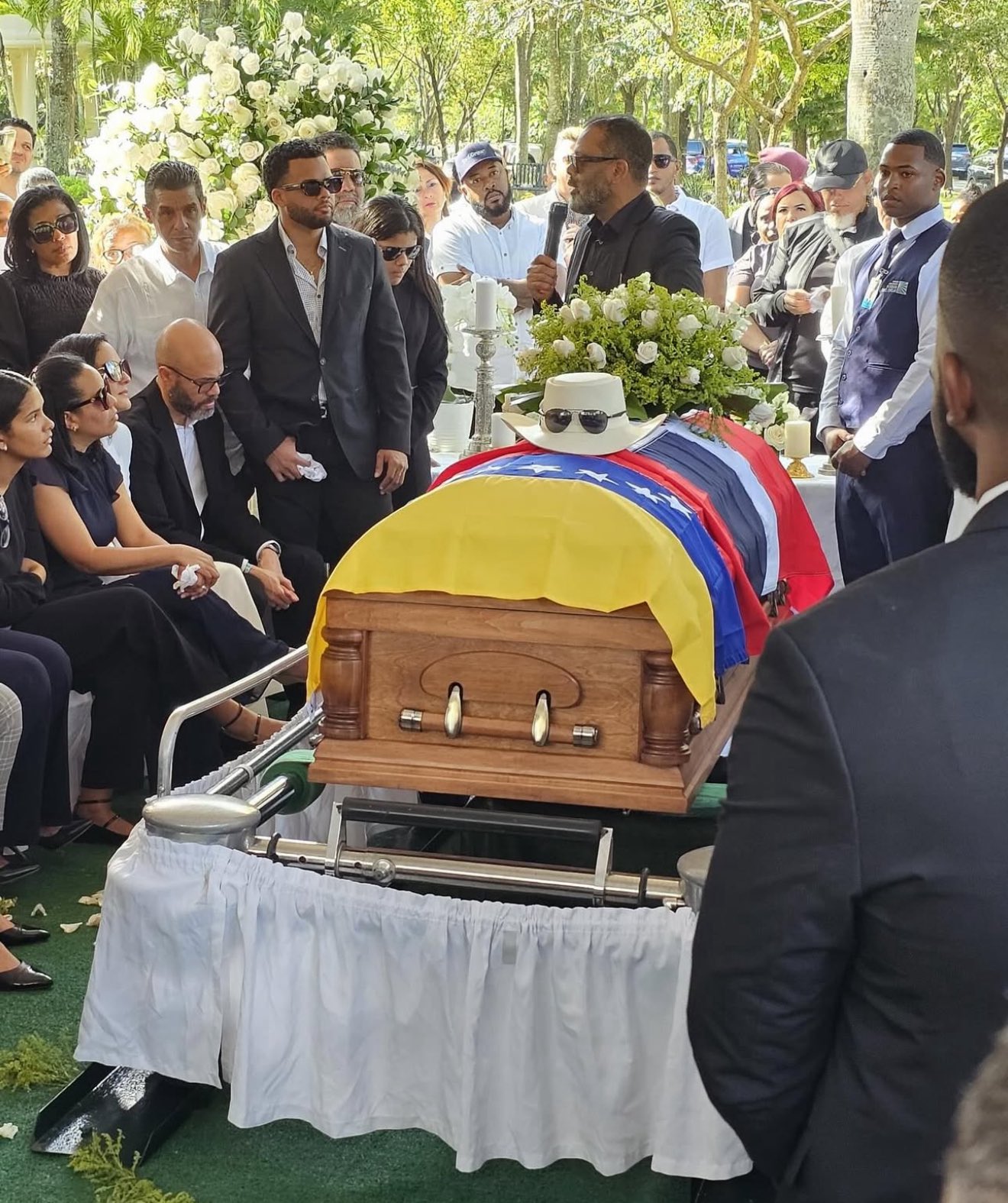 Personas de todas las edades, artistas, políticos, periodistas, en su mayoría vestidas de negro, desafiaron las elevadas temperaturas y desfilaron por el Teatro Nacional de Santo Domingo, donde fue expuesto su ataúd, adornado con su característico sombrero y sus gafas de sol, y ocasionalmente con la bandera de Venezuela, país al que él se refería como su segunda patria.