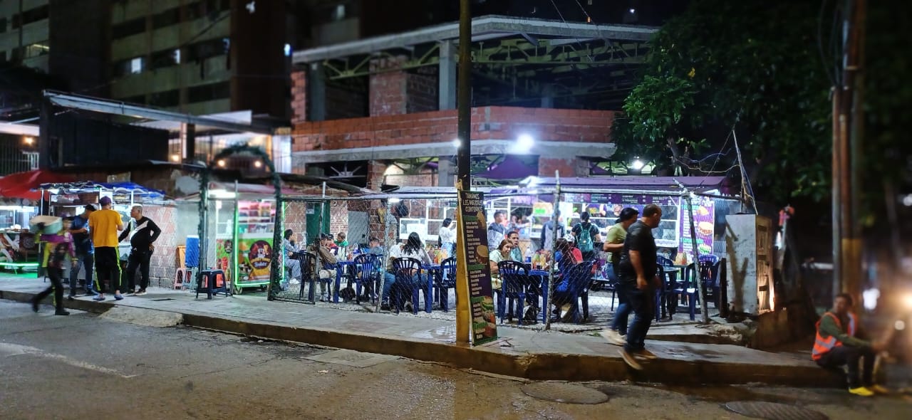 Entre las aceras y la calle se instalan dos carros de venta callejera de arepas, un carro de perros calientes y al menos cuatro mesas en la que se venden caramelos, cigarrillos y alguna sorpresita (como una cerveza).