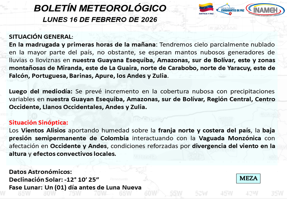 El Instituto Nacional de Meteorología e Hidrología (INAMEH) ha emitido su boletín oficial para este lunes 16 de febrero, destacando condiciones climáticas variables que afectarán gran parte del territorio nacional debido a diversos fenómenos atmosféricos.