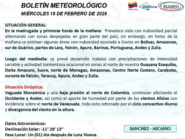 De acuerdo con el boletín del Instituto Nacional de Meteorología e Hidrología (Inameh), luego del mediodía se prevé desarrollo nuboso con precipitaciones de intensidad variable y actividad tormentosa ocasional en zonas al norte de la Guayana Esequiba, Delta Amacuro, Sucre, norte de Monagas, Amazonas, Centro Norte Costero, Carabobo, sureste de Falcón, Yaracuy, Apure, Andes y Zulia.