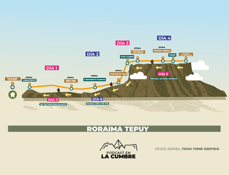 Los anfitriones Juan Sofa y Jhon Snacks llevarán sus micrófonos hasta el corazón del Parque Nacional Canaima, en una ruta de siete días que partirá desde Santa Elena de Uairén, pasará por Paraitepuy y el Río Tek, hasta alcanzar el Punto Triple, donde convergen las fronteras de Venezuela, Brasil y Guyana. Durante el trayecto, el equipo conectará con comunidades indígenas, explorará los paisajes del tepuy y transmitirá más de 14 horas en vivo a través de plataformas digitales.