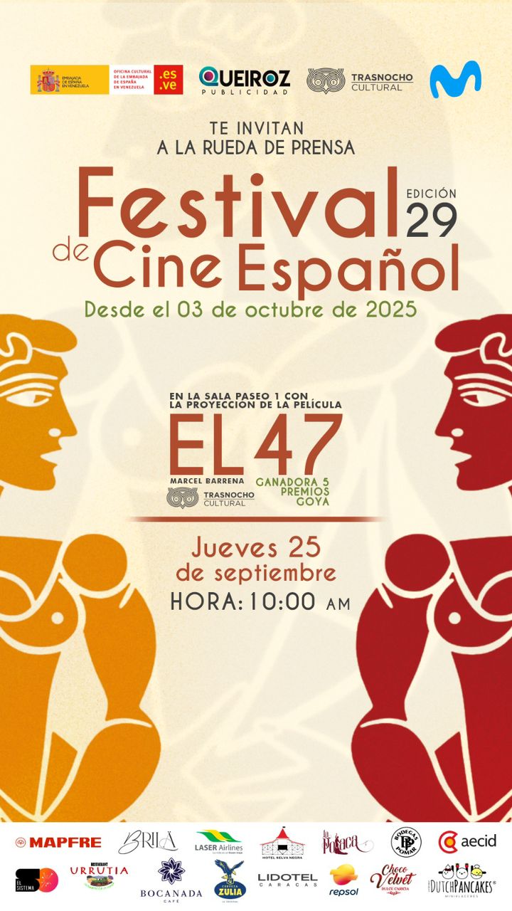Sin duda, nada de esto sería posible sin el apoyo de los aliados que forman parte fundamental de esta edición del Festival de Cine Español 2025 como lo son: Mapfre @mapfre_ve, Movistar @movistarve, Repsol @repsol, EL Sistema @elsistema_, Laser Airlines @laserairlinesoficial, Cervecería Zulia @cervezazulia, Brila @brila.ccs, Pomar @bodegaspomar, Aecid @aecid_es, Bocanada Café @bocanadacafe, Lidotel @lidotel, Hotel Selva Negra @hotelselvanegra, Panadería Rosita Caracas @panaderiarositaccs, Restaurante Urrutia @urrutia_rest, La Polaca @lapolacaflamenca, Choco Velvet @chocovelvet.vzla y Dutch Pancakes @dutchpancakesvzla.