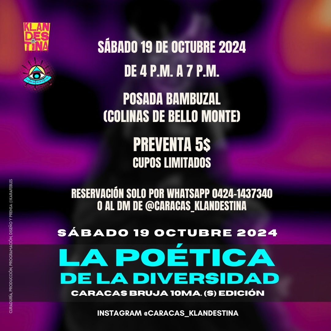 Esta sábado 19 de octubre, de 4 a 7 p.m. se celebrará a propósito del reciente Día Mundial del respeto por la diversidad cultural, la Décimaprovocación de @caracas_klandestina: “ CARACAS BRUJA: LA POÉTICA DE LA DIVERSIDAD”