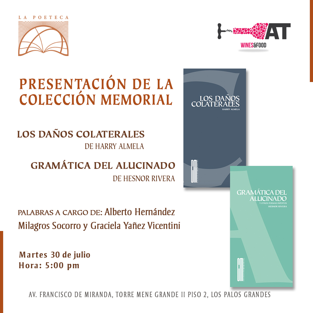 Este martes 30 de julio será presentado el libro Daños Colaterales, de Harry Almela, un texto póstumo. El poemario ofrece otros lúcidos epílogos de Alberto Hernández y Antonio López Ortega e incluye el poema que da título a este libro, que forma parte del poemario de Almela.