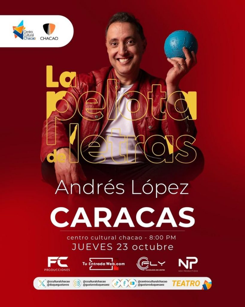El reconocido artista Andrés López se presentará el próximo jueves 23 de octubre en el Centro Cultural Chacao de Caracas con su espectáculo «La Pelota de Letras».