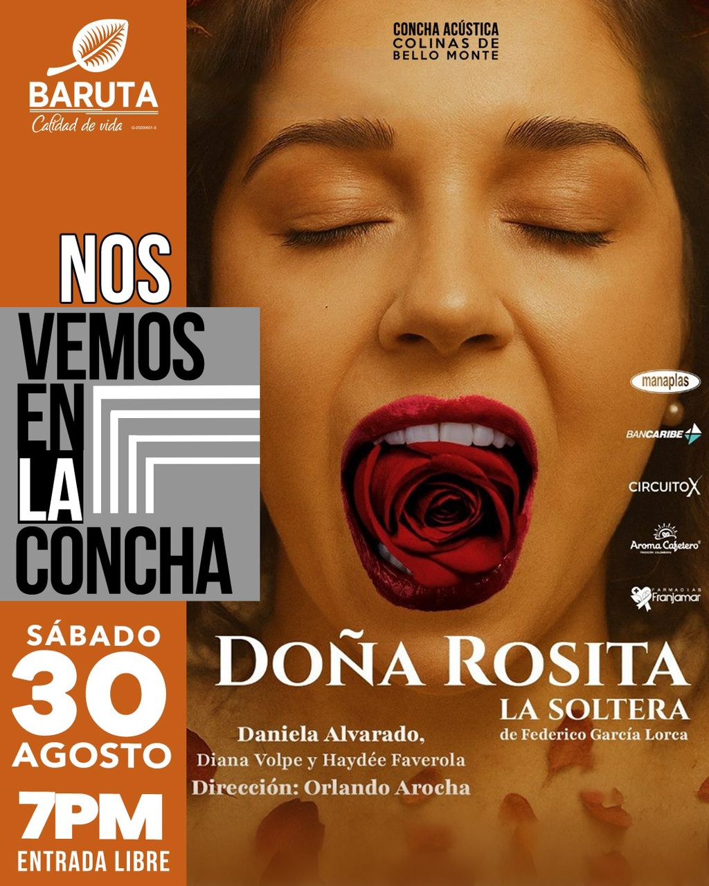 La oportunidad para disfrutar de este gran texto de Lorca: “Doña Rosita, la Soltera” es este sábado 30 de agosto cuando a partir de las 5:00 pm se abrirá el acceso a La Concha Acústica en Colinas de Bello Monte para que el público pueda disfrutar totalmente gratis de este montaje a las 7:00 pm, con la vigilancia y logística garantizada en la zona por la Alcaldía de Baruta.
