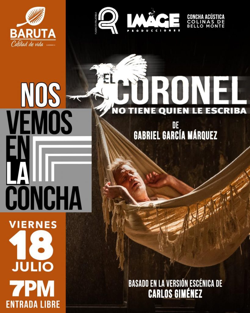 El programa cultural “Nos Vemos en la Concha”, impulsado por el alcalde de Baruta Darwin González, continúa brindando opciones artísticas de calidad para el disfrute de los caraqueños. En esta ocasión, presentará el aclamado montaje “El Coronel no tiene quien le escriba”, basado en la obra de Gabriel García Márquez y bajo la dirección de Carlos Scoffio, quien retoma la icónica adaptación teatral de Carlos Giménez. La función especial se realizará el viernes 18 de julio a las 7:00 pm en La Concha Acústica de Colinas de Bello Monte, con entrada libre.