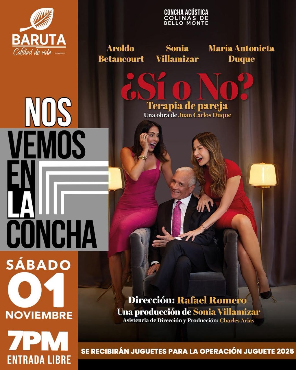 Este sábado 01 de noviembre, el público caraqueño podrá disfrutar gratuitamente de la exitosa comedia “¿Sí o No? Terapia de Pareja”, protagonizada por Sonia Villamizar, María Antonieta Duque y Aroldo Betancourt, en el marco del programa cultural “Nos Vemos En La Concha”, impulsado por la Alcaldía de Baruta.