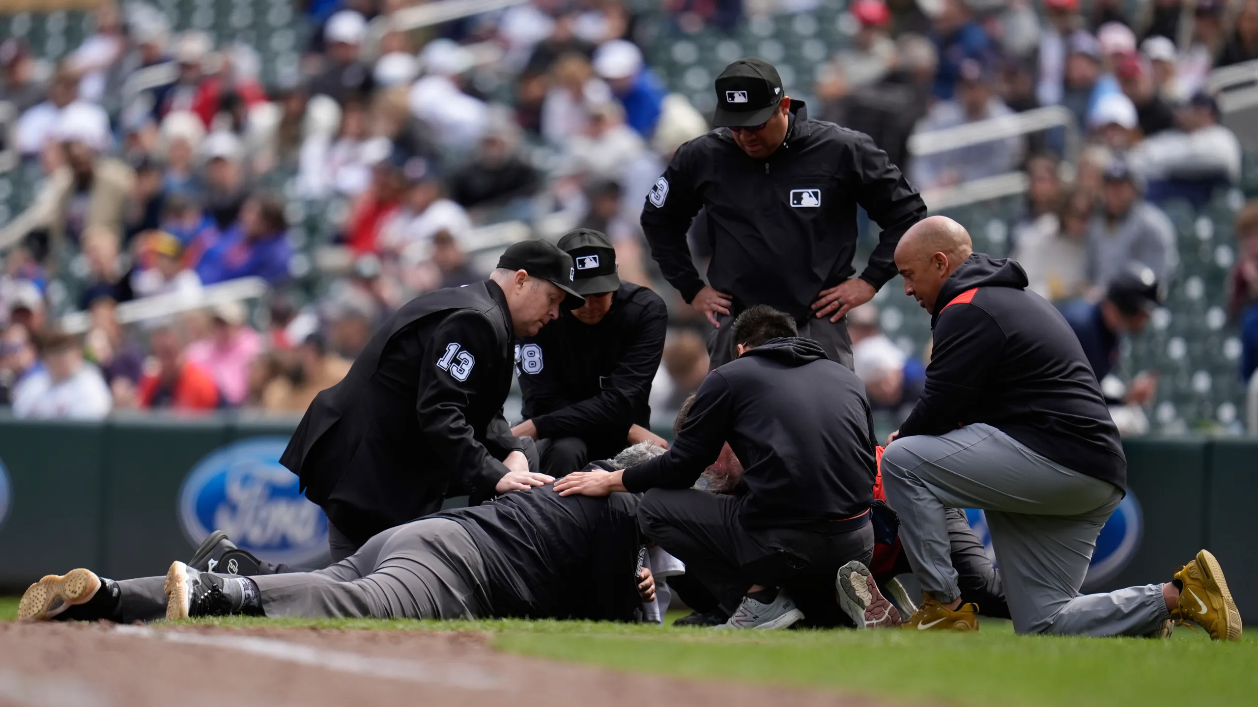 Wendelstedt, de 53 años, permaneció en el suelo durante un par de minutos mientras era atendido por el personal médico de los Mellizos y pudo caminar lentamente por su cuenta, presionando una toalla contra el lado izquierdo de su cabeza. El umpire de segunda base, Adam Hamari, se movió a primera en el equipo de tres hombres para el resto del juego.