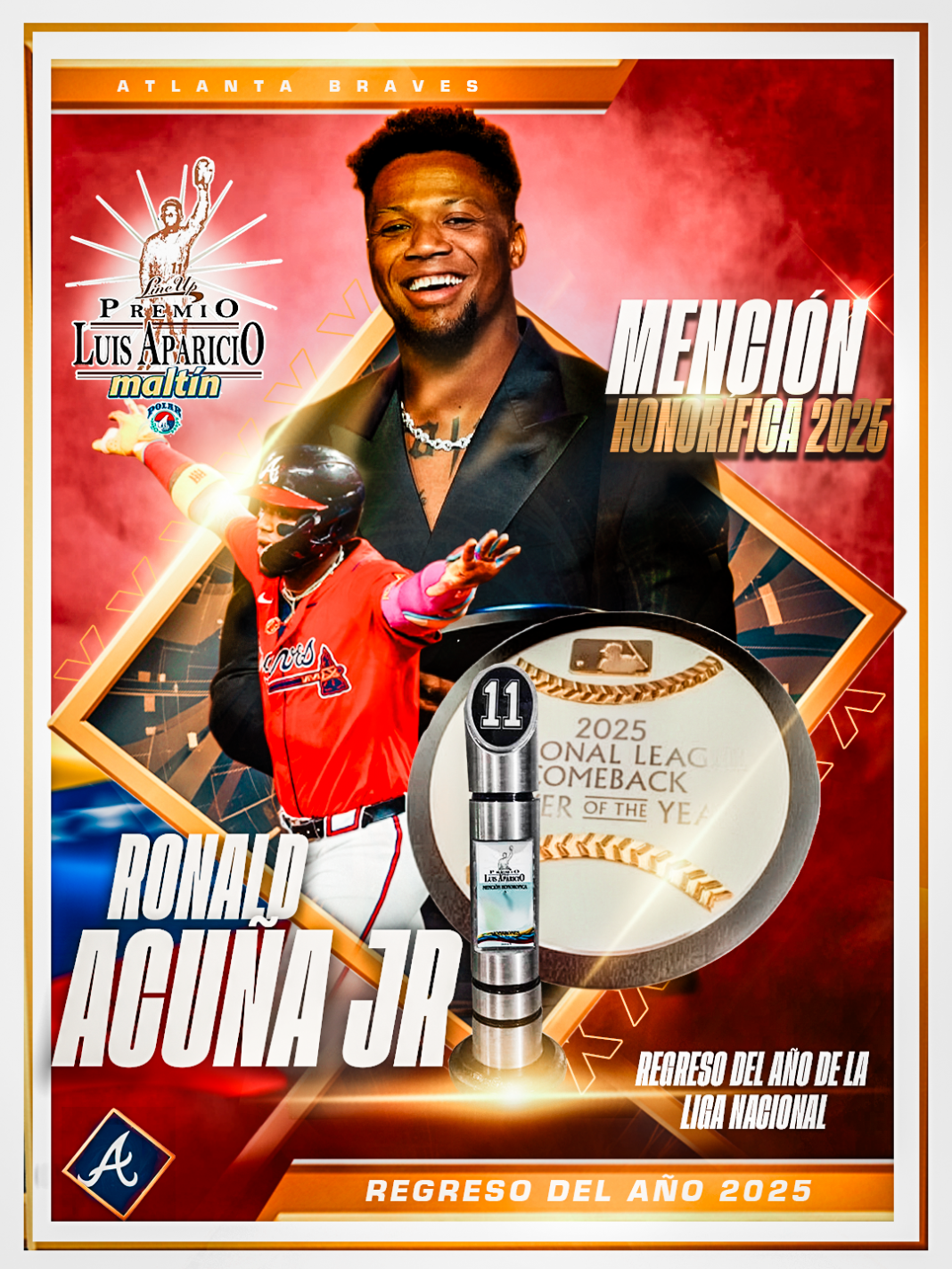 Ronald Acuña Jr., jugador de los Bravos de Atlanta, fue reconocido con una Mención Honorífica del Premio Luis Aparicio en su edición número 22, luego de obtener el galardón al Regreso del Año de la Liga Nacional en la temporada 2025 de las Grandes Ligas.