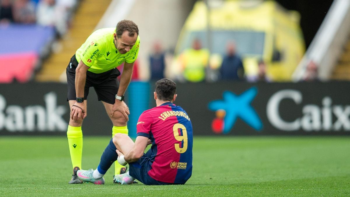Lewandowski encendió todas las alarmas en el FC Barcelona. A una semana de que el equipo azulgrana se juegue el título de la Copa del Rey, en la final ante el Real Madrid en el estadio de La Cartuja, el delantero polaco tuvo que retirarse lesionado del encuentro de este sábado ante el Celta en Montjuïc. En el minuto 76, Lewandowski se echó la mano al músculo isquiotibial izquierdo y miró hacia el banquillo para pedir el cambio. Desde su entorno son pesimistas de que pueda estar en la final de la Copa del Rey y podría peligrar su presencia también en la eliminatoria de Champions