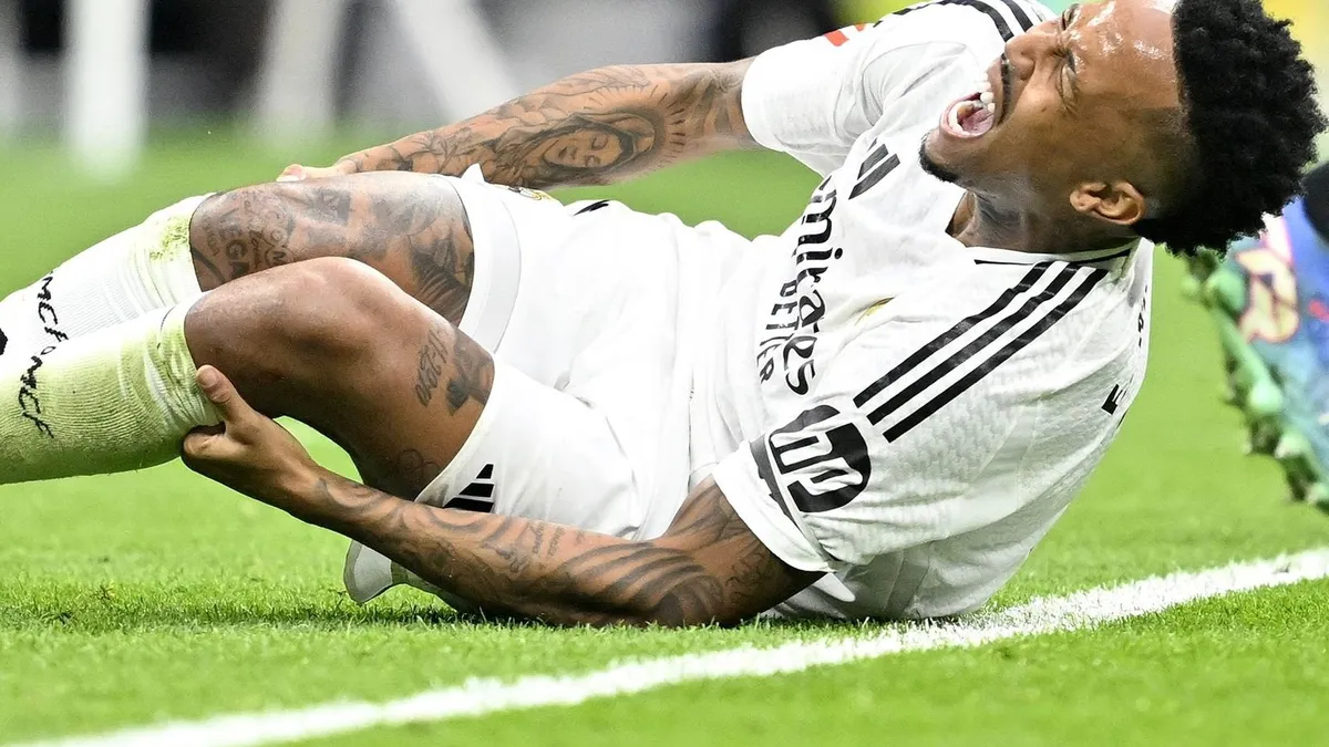 Éder Militao, operado de una rotura del ligamento cruzado anterior de la rodilla izquierda en agosto de 2023, el central brasileño dejó el césped en camilla, por la que apunta a ser una lesión grave en la rodilla derecha. De confirmarse, sería la segunda de gravedad en 15 meses. La reacción de sus compañeros, con las manos en la cabeza, lo decía todo.