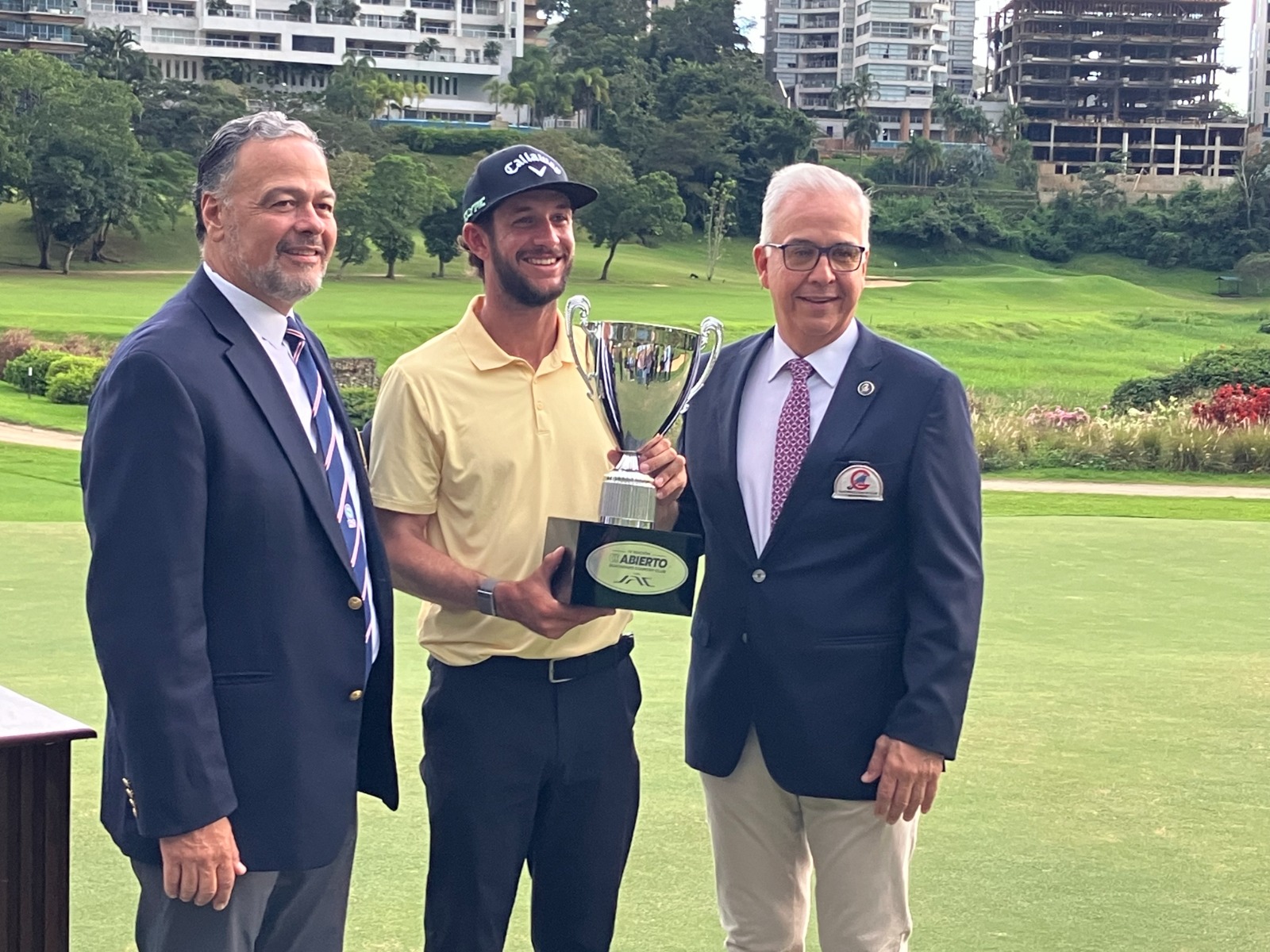 El presidente de la Federación Venezolana de Golf, Felipe Rodríguez, estuvo acompañado por el presidente del centro social y deportivo, Carlos Rached, y el presidente de JAC Motors en Carabobo y principal patrocinante, Luis Cano, para presentar la Copa y el cheque ganador al campeón.