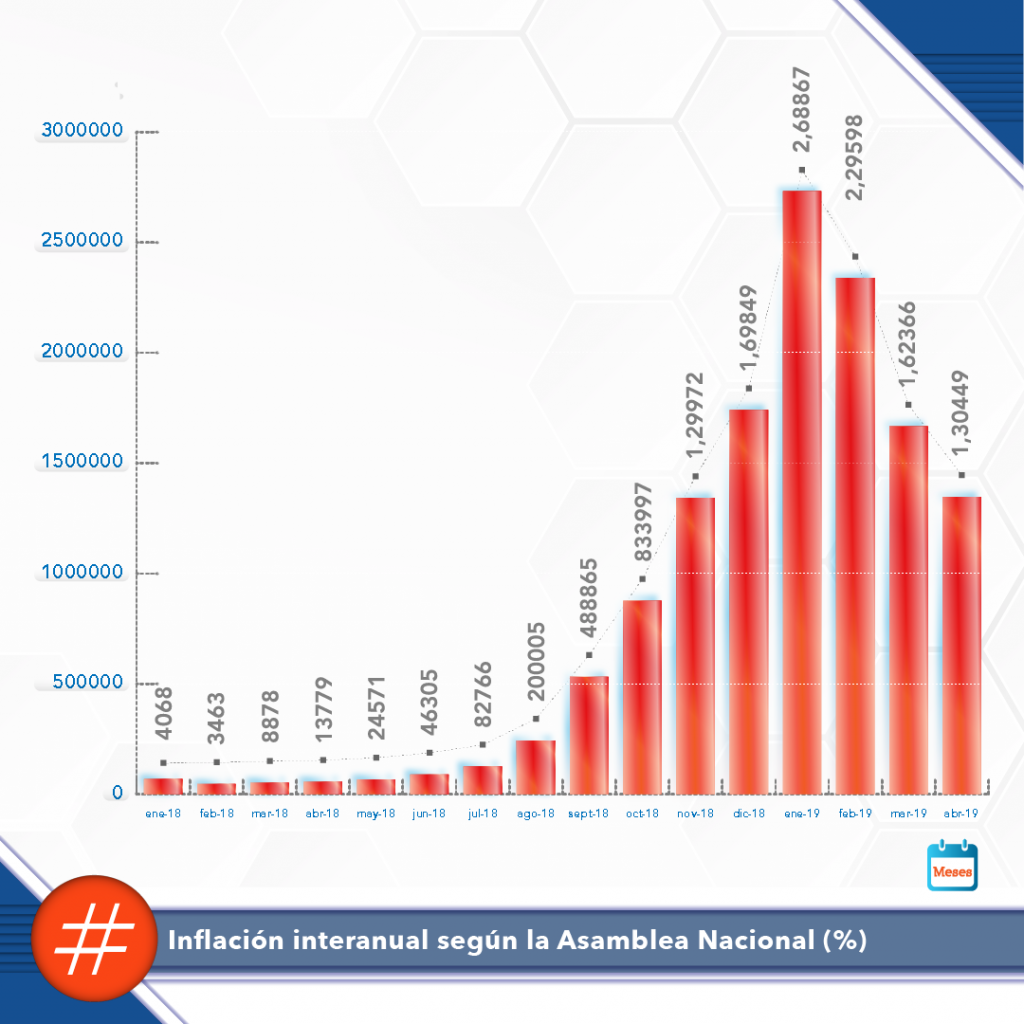 De acuerdo con las cifras de la Asamblea Nacional, la inflación interanual al mes de abril fue de 1.304.494%, mientras que el dólar oficial registró un incremento interanual de 753.908,69%, tomando en cuenta que esta divisa oficial cerró el 28 de abril de 2018 al equivalente a 0,69 bolívares (69.000 bolívares fuertes antes de la reconversión).