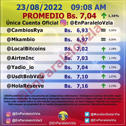 La cotización del dólar en el mercado paralelo presentó una variación en relación al cierre del pasado lunes, su valor en la mañana de este martes 23 de agosto es de Bs. 7,04 de acuerdo a la cuenta @EnParaleloVzla de instagram.