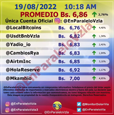 La cotización del dólar en el mercado paralelo presentó una leve variación en relación al cierre del pasado jueves, su valor en la mañana de este viernes 19 de agosto es de Bs. 6,86 de acuerdo a la cuenta @EnParaleloVzla de instagram.