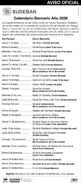 El próximo lunes 12 de enero de 2026, el sector bancario no prestará servicio en todo el país por el «Día de Reyes», según el calendario establecido por la Superintendencia de las Instituciones del Sector Bancario (Sudeban).