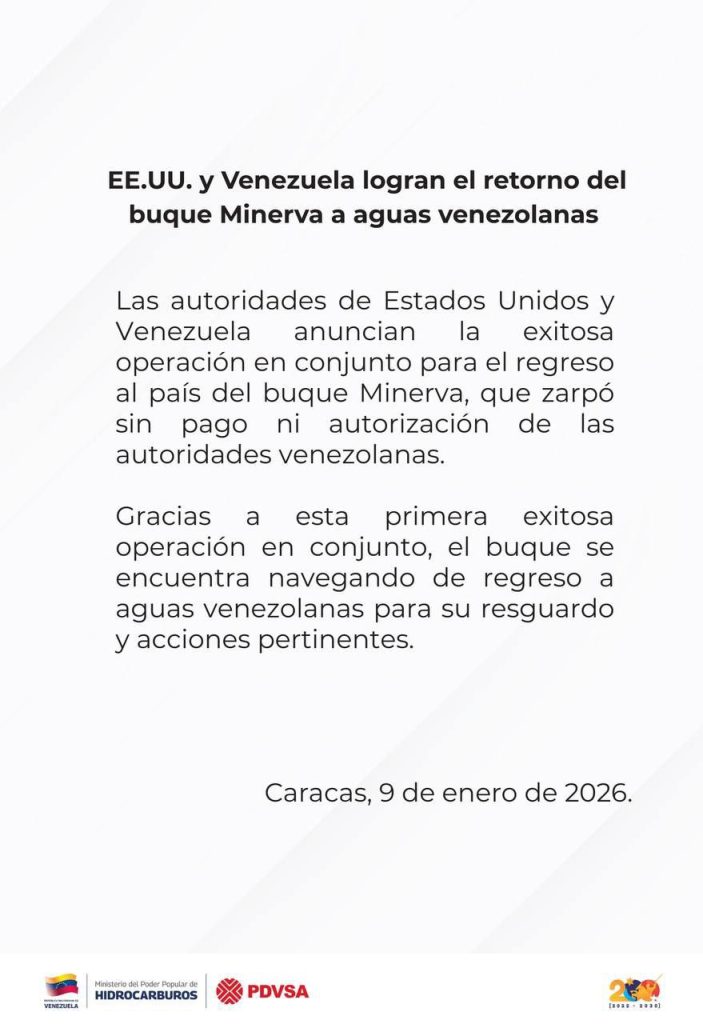 Petróleos de Venzuela SA (Pdvsa) anunció que tras un acuerdo entre los Estados Unidos y Venezuela, el buque petrolero Minerva -que había sido retenido por EEUU- retornará a aguas venezolanas.
