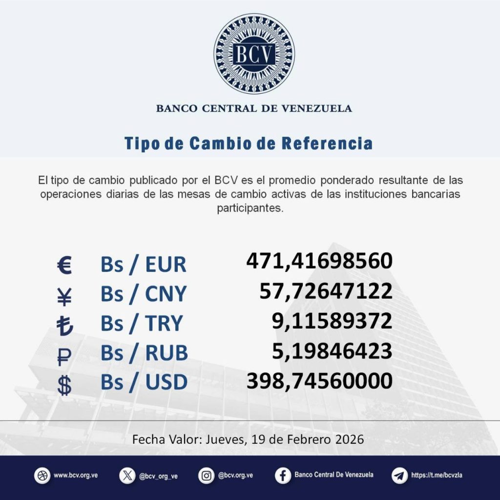 El Banco Central de Venezuela (BCV) informó que la tasa de cambio que regirá las operaciones económicas de este jueves 19 de febrero será de 398,74 bolívares por cada dólar.