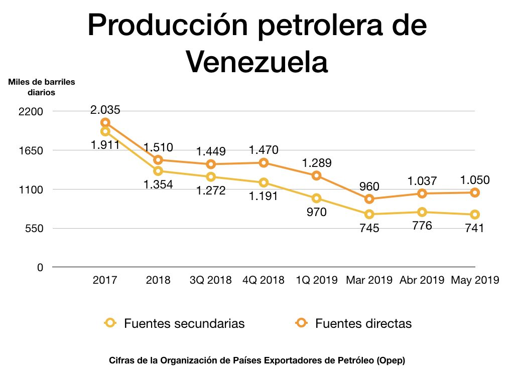Entre mayo de 2018 y mayo de 2019, Venezuela dejó de percibir 12.356 millones de dólares por ingresos petroleros, tomando como referencia las cifras de producción de las fuentes secundarias de la Organización de Países Exportadores de Petróleo (Opep).