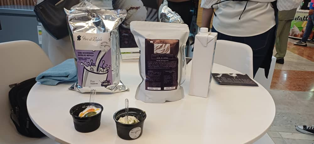 Para el sector heladero hay un producto estrella: una mezcla para helado que se une con la crema de búfala y el agua en una máquina especial «y prepara helado en 20 minutos; un helado artesanal de gran calidad con sabor exclusivo». Las búfalas proceden del Sur del Lago en este momento, apuntó Delfino.