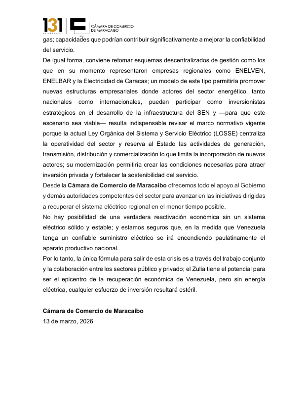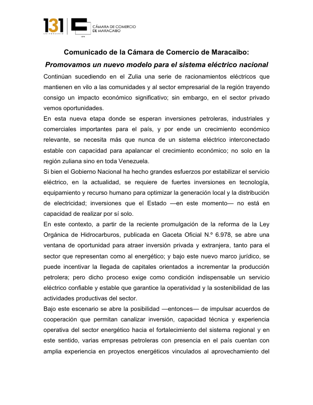 Por medio de una nota de prensa, la organización señaló que «en esta nueva etapa, donde se esperan inversiones petroleras, industriales y comerciales importantes para el país, y por ende un crecimiento económico relevante, se necesita más que nunca de un sistema eléctrico interconectado estable con capacidad para apalancar el crecimiento económico, no solo en la región zuliana, sino en toda Venezuela».