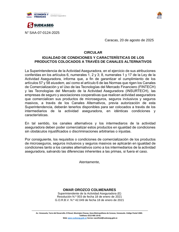 Por medio de una circular, la institución indicó que, en cumplimiento de la Ley de la Actividad Aseguradora y de las normas que rigen los Canales de Comercialización y el Uso de las Tecnologías del Mercado Financiero (Fintech) y las Tecnologías del Mercado de la Actividad Aseguradora (Insurtech), las empresas de seguro y asociaciones cooperativas que realicen actividad aseguradora y que comercialicen sus productos de microseguros, seguros inclusivos y seguros masivos, a través de los Canales Alternativos, deberán tenerlos disponibles para ser colocados a través de los intermediarios de la actividad aseguradora, en idénticas condiciones y características.