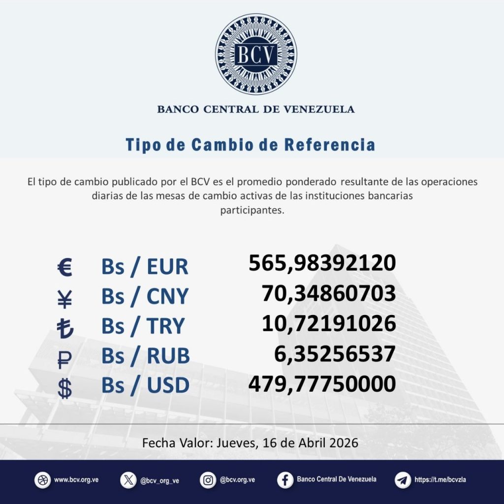 El Banco Central de Venezuela (BCV) informó que la tasa de cambio que regirá las operaciones económicas de este jueves 16 de abril será de 479,77 bolívares por cada dólar.