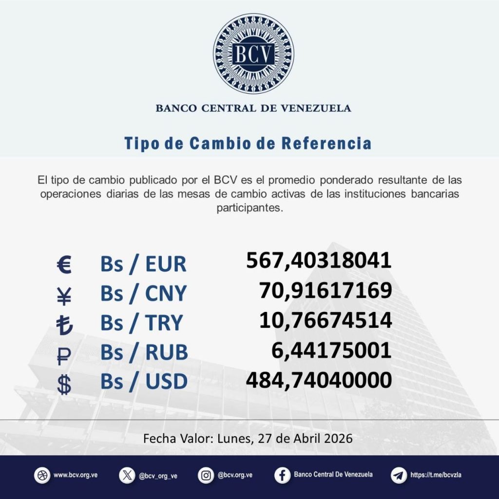 El Banco Central de Venezuela (BCV) informó que la tasa de cambio que regirá las operaciones económicas de este lunes 27 de abril será de 484,74 bolívares por cada dólar.