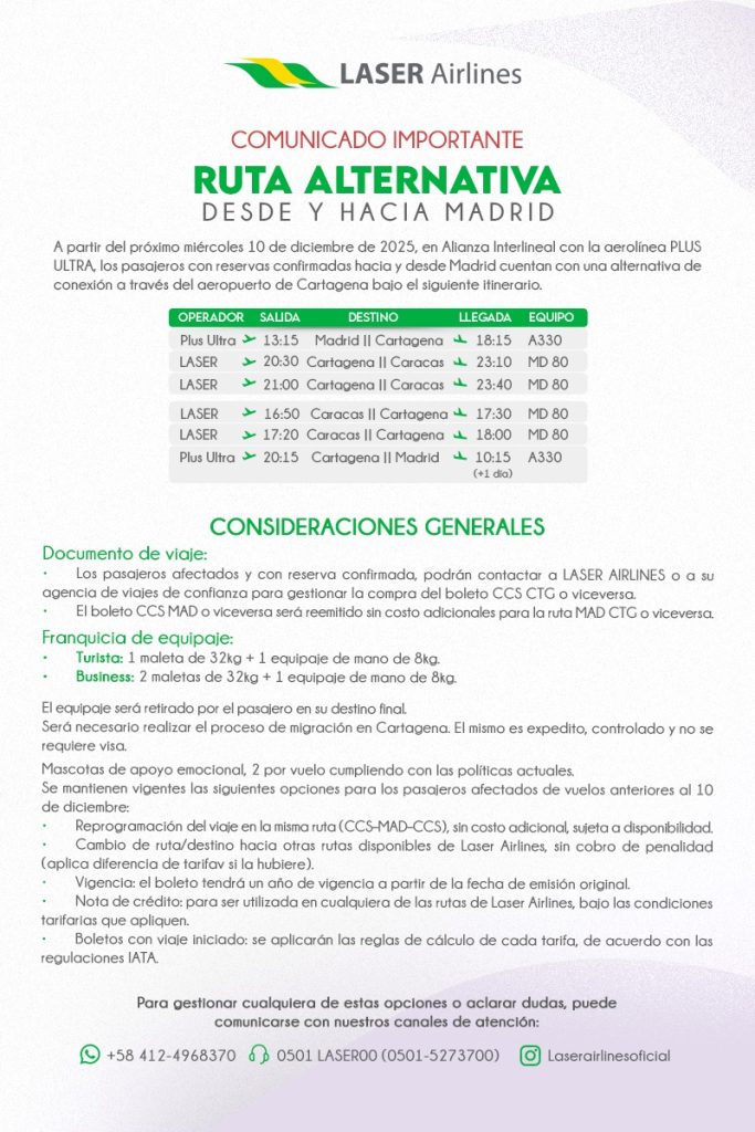 Laser Airlines informó que desde este 10 de diciembre de 2025, volará entre Caracas y Madrid, en alianza internacional con la aerolínea Plus Ultra, haciendo conexión en el Aeropuerto de Cartagena, en Colombia.