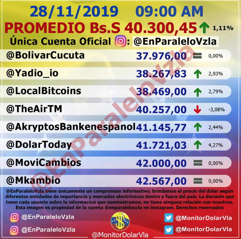 EconomíaTipo de Cambio ¡Otro escalón! Dólar paralelo rompe la barrera de los Bs 40.000 28 noviembre, 2019 Share FacebookXPinterestWhatsApp La cotización de la divisa estadounidense sigue su impulso al alza Según las cifras del Monitor Dólar la relación entre el dólar y el bolívar soberano se movió al alza en su apertura y comenzó el día con un aumento de 1,11%.