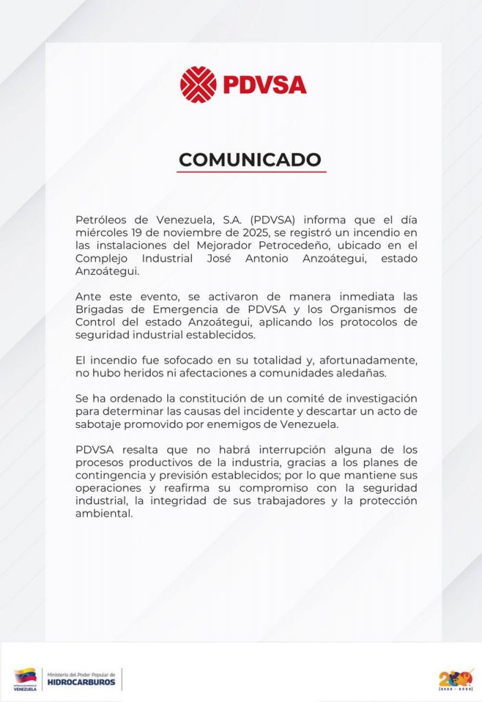PDVSA indicó que continuará informando sobre los avances relacionados con este incidente.